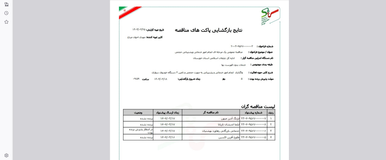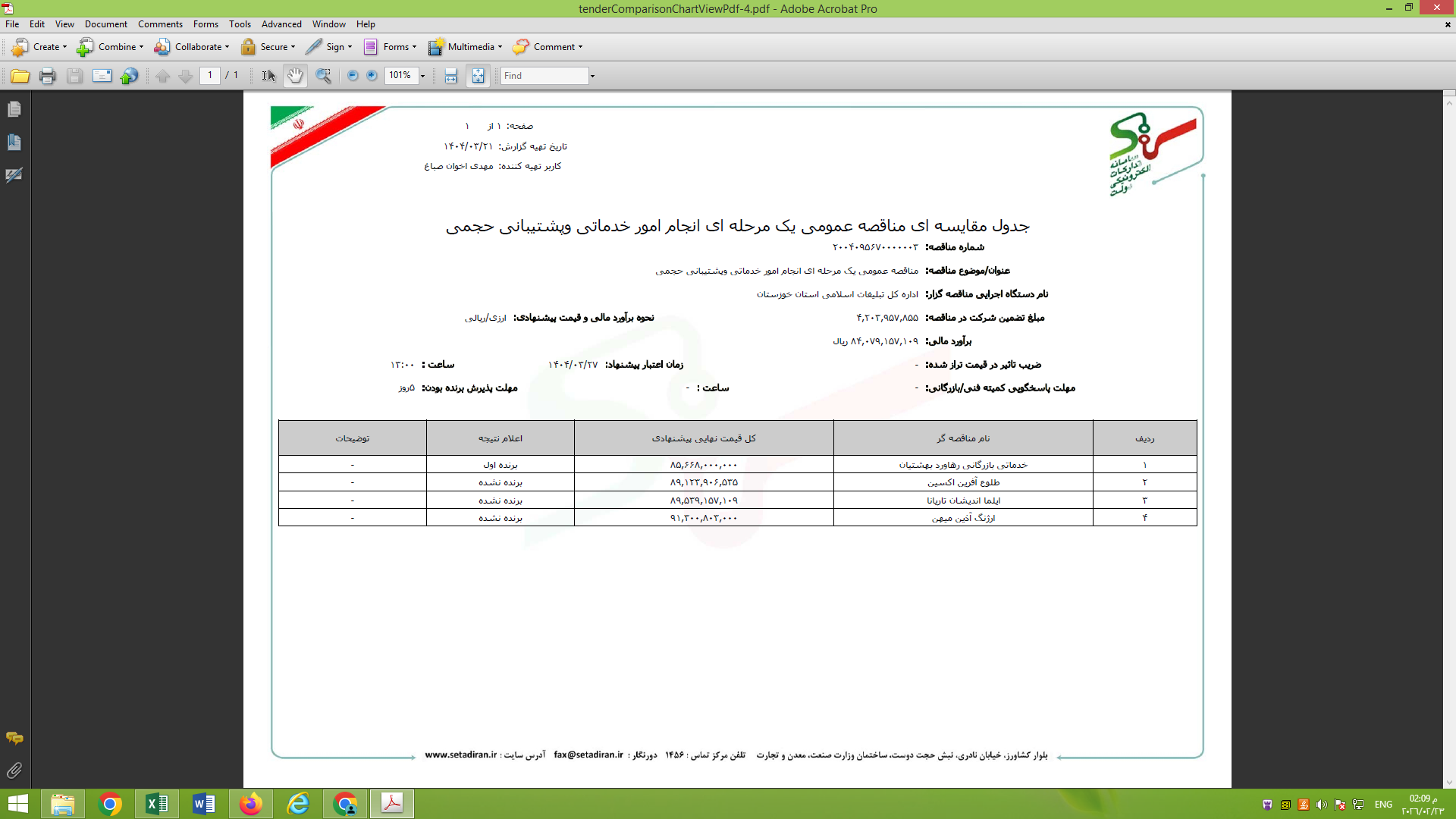 جدول مقایسه ای مناقصه یک مرحله ای انجام امور خدماتی و پشتیبانی حجمی و برنده آن