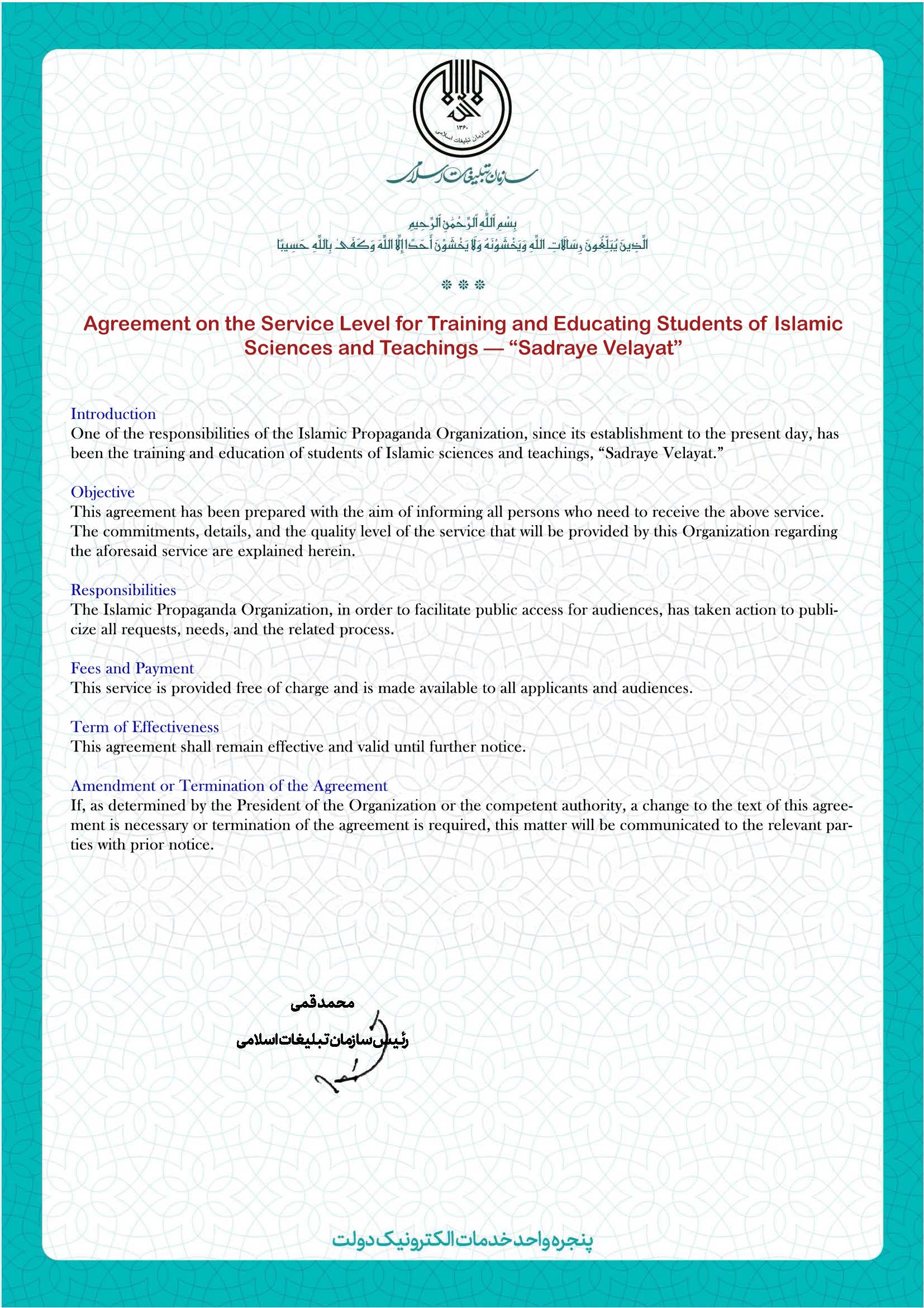 This service aims to educate and train students of the “Sadrā-ye Velayat” Islamic Sciences and Teachings program by providing structured religious instruction and character development, strengthening their understanding of Islamic knowledge and values, and preparing them for informed, responsible participation in religious, cultural, and social contexts.