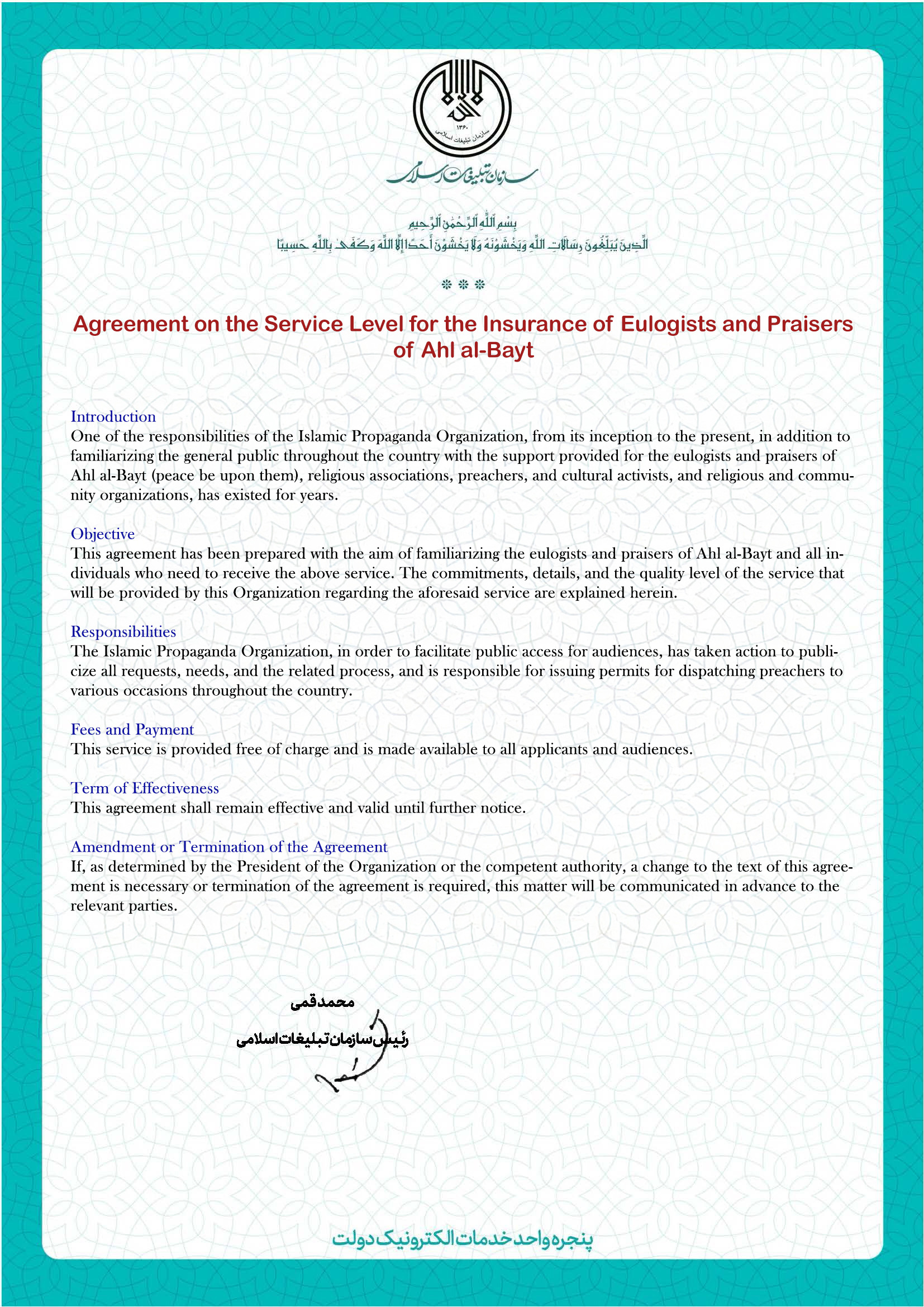 This service aims to provide insurance coverage for eulogists and reciters who praise Ahl al-Bayt (peace be upon them), in order to support their welfare and job security, reduce financial risks related to healthcare and other insured events, and ensure they can continue their religious and cultural activities with greater stability.