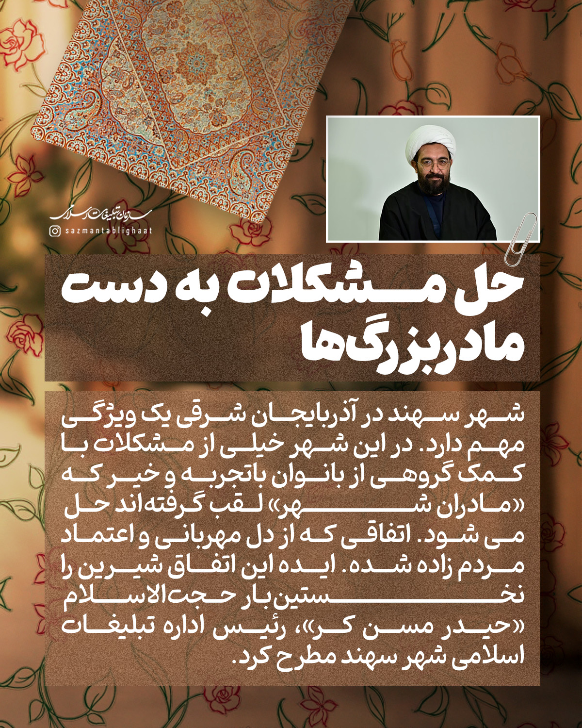 به گزارش روابط عمومی سازمان تبلیغات اسلامی، در شهر سهند آذربایجان شرقی، گروهی از بانوان خیر و باتجربه با نام «مادران شهر» نقشی کلیدی در حل مشکلات محلات ایفا می‌کنند. این طرح که به ابتکار حجت‌الاسلام حیدر مسن‌کر، رئیس اداره تبلیغات اسلامی سهند، شکل گرفته، مادران محلی را به حلقه‌ ارتباط میان مردم و نهادهای شهری تبدیل کرده است. از کمک به خانواده‌های نیازمند و مدیریت اعتکاف گرفته تا میانجی‌گری در مسائل اجتماعی؛ الگویی برای حکمرانی مردمی. در این شماره از نشریه دیجیتال از سهند و طرح مادران شهر می‌خوانیم.