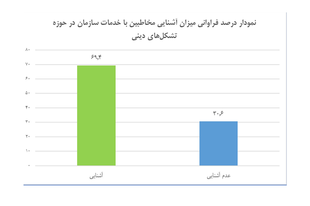 آمار دریافت شده از پاسخ سوال "آیا با خدمات سازمان هیأت و تشکلهای دینی به عنوان متولی فعالیتهای مربوط به تشکلهای دینی سازمان تبلیغات اسلامی آشنایی دارید؟" حاکی از این است که اکثریت کاربران و متقاضیان خدمات حوزه تشکلهای دینی، با سازمان هیأت و تشکلهای دینی آشنایی دارند. همچنین با توجه به عدم آشنایی سی درصدی کاربران با سازمان مذکور و خدمات آن، این مهم نیازمند بهبود فرایندهای ارائه خدمات الکترونیک در سطوح مختلف اطلاعرسانی، تولید، ارائه و پشتیبانی خدمات است.