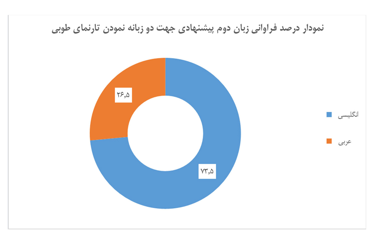 طبق آمار حاصل از سوال "برای دوزبانه شدن تارنمای ارائه خدمات حوزه هیئت و تشکلهای دینی، کدام یک از زبانهای زیر را پیشنهاد میکنید؟" درصد قابل توجهی از کاربران و مخاطبین تارنمای سازمان، زبان انگلیسی را به عنوان زبان دوم جهت چند زبانه شدن تارنمای طوبی انتخاب کردهاند که میتوان در فازهای آتی توسعه سامانه این مورد را مد نظر قرار داد.