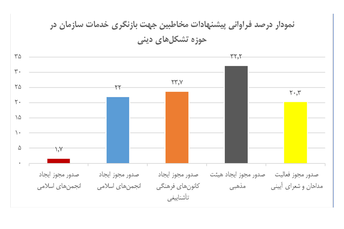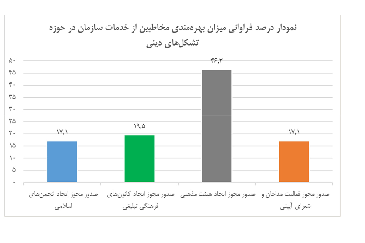 آمار دریافتی از سوال " شما از کدامیک از خدمات تشکلهای دینی سازمان تبلیغات اسلامی که به صورت الکترونیکی ارائه میگردند، بهرهمند شدهاید؟" نمایانگر این است که درصد قابل توجهی از مخاطبین خدمات سازمان، از سبد خدمات الکترونیک که در حوزه تشکلهای دینی ارائه میشود، صدور مجوز ایجاد هیئت مذهبی را به عنوان خدمت مورد نظر انتخاب نمودهاند. این آمار، ضرورت بهبود فرایند این خدمت به عنوان یک خدمت پرمخاطب از خدمات الکترونیک سازمان را ایجاب میکند.