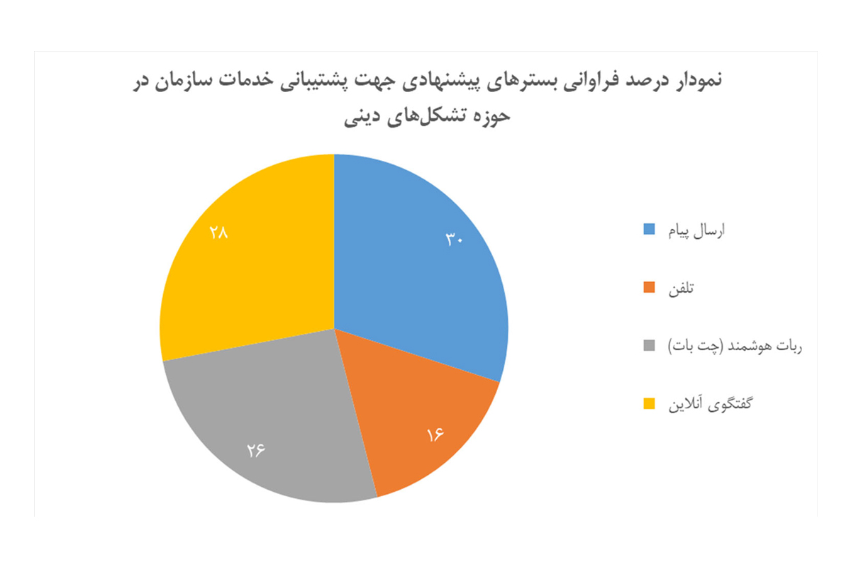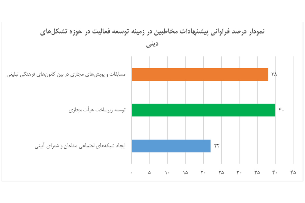 آمار دریافت شده از پاسخ سوال "کدام یک از فعالیتهای زیر را در ترویج و توسعه تشکلهای دینی پیشنهاد میکنید؟" نشاندهنده اقبال قابل توجه مخاطبین به برگزاری مسابقات و پویشهای مجازی در بین کانونهای فرهنگی تبلیغی و همچنین توسعه زیرساخت هیأت مجازی میباشد. در این خصوص میبایست نسبت به توسعه زیرساخت ارائه سرویسهای و بستههای فرهنگی تبلیغی به صورت مجازی اقدام شود.