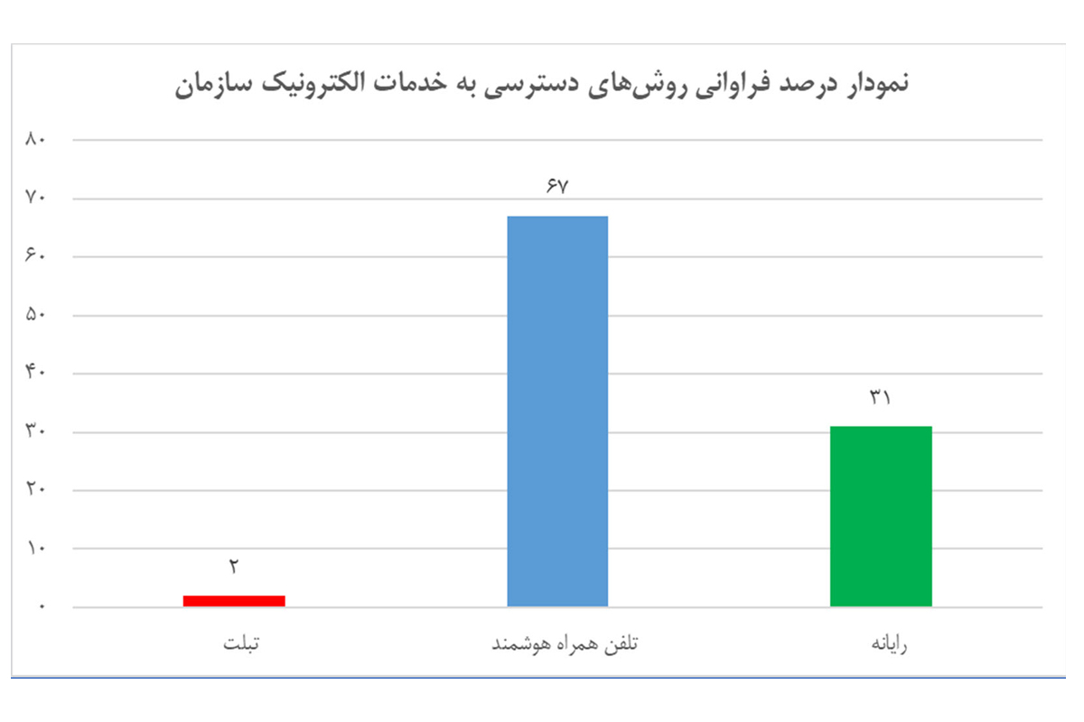 طبق آمار حاصل از پاسخ سوال "بیشترین نوع دسترسی شما به خدمات الکترونیک سازمان تبلیغات اسلامی از طریق کدام یک از ابزارهای زیر میباشد؟" بالغ بر دو سوم متقاضیان خدمات الکترونیک سازمان، جهت دریافت خدمات مورد نظر خود از میز خدمت سازمان، از تلفن همراه هوشمند استفاده میکنند. این عدد ضرورت توسعه خدمات الکترونیک در سکوی تلفن همراه را نشان میدهد. همچنین لزوم رعایت استانداردهای بصری در تارنماهای خدمات، از جمله واکنشگرا بودن را نیز نمایان میکند.