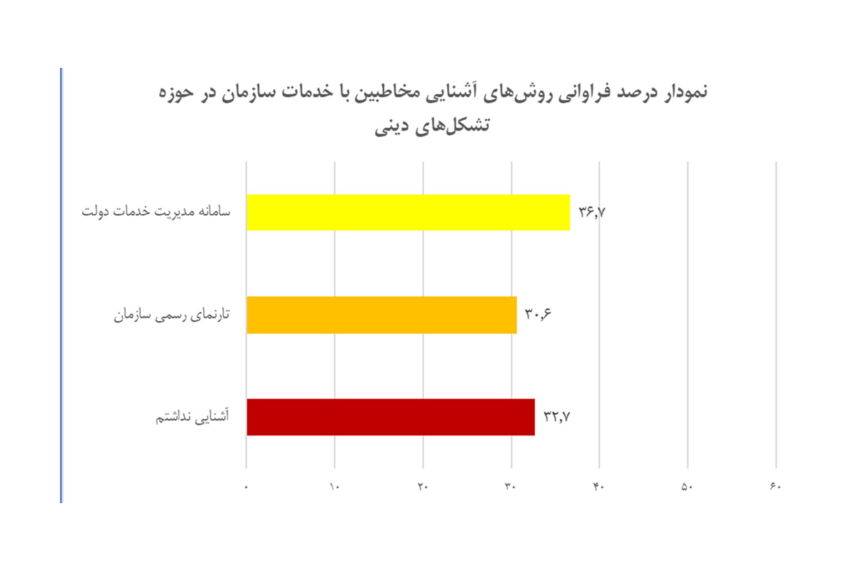 نتایج حاصل از سوال " آشنایی شما با خدمات مرتبط با تشکلهای دینی سازمان تبلیغات اسلامی از چه طریقی بوده است؟" حاکی از تثبیت خدمات الکترونیک سازمان در پنجره واحد خدمات دولت هوشمند و همچنین میزخدمت الکترونیک تارنمای رسمی سازمان به عنوان درگاههای ارائه خدمات الکترونیک به کاربران میباشد. در خصوص آشنایی هر چه بیشتر کاربران با خدمات حوزه هیأت و تشکلهای دینی سازمان نیز میبایست نسبت به تبیین و اطلاعرسانی در خصوص تنوع خدمات قابل ارائه به مخاطبین تصمیمات متقضی اتخاذ و اجرایی شود.