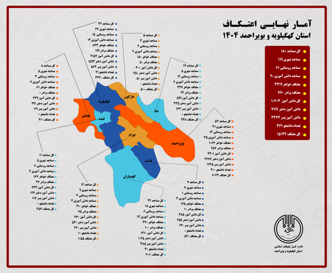 به گزارش روابط عمومی سازمان تبلیغات، 180 مسجد در کهگیلویه و بویراحمد میزبان 15 هزار و 144 معتکف بود.
