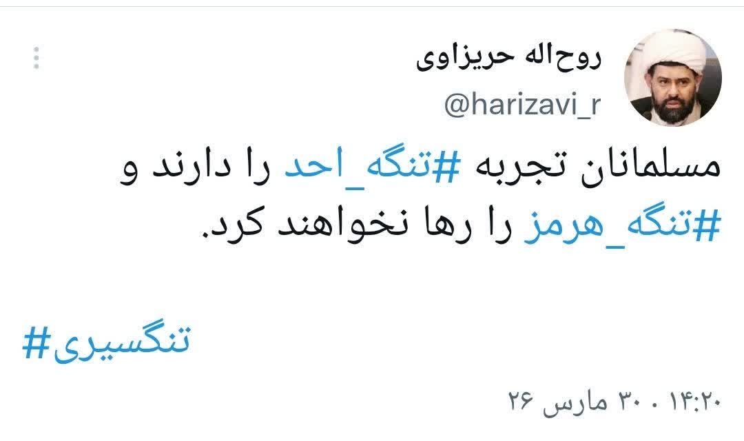 قائم مقام سازمان تبلیغات اسلامی در صفحه شخصی خود نوشت، مسلمانان تجربه احد را دارند و تنگه هرمز را رها نخواهد کرد.