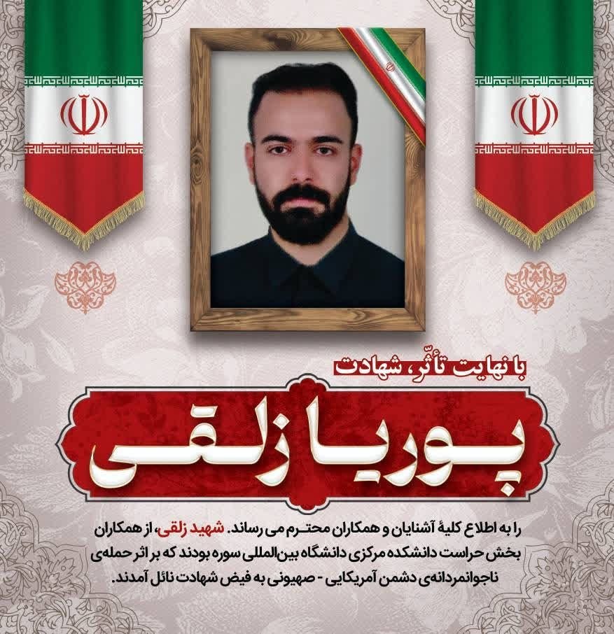 در همین فهرست، پوریا زلقی، از همکاران بخش حراست دانشکده مرکزی دانشگاه بینالمللی سوره نیز در زمره شهدای این جنایت قرار گرفت؛ نیرویی که در جایگاه پاسداری از امنیت و نظم، بیوقفه خدمت میکرد و سرانجام جان خود را در مسیر امنیت این خاک تقدیم کرد.