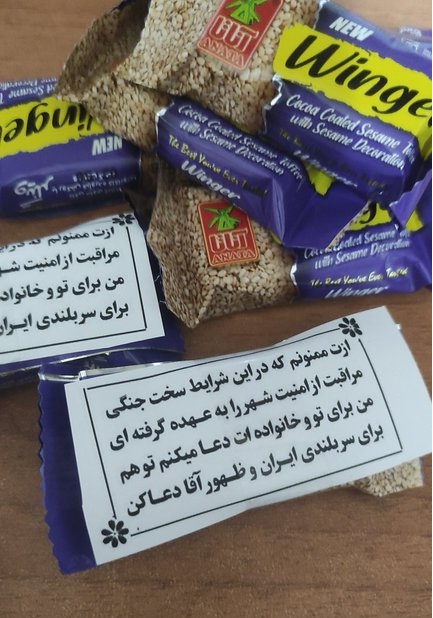 افراد برای قدردانی از نیروهای امنیتی و انتظامی هر کاری از دستشان برمیآید، کردهاند. یکی از آنها، برگهای را روی بستههای بیسکوییت چسبانده و از آنهایی که محافظ امنیت آنها هستند، قدردانی کرده است. او نوشت: «ازت ممنون که در این شرایط سخت جنگی مراقبت از امنیت شهر را به عهده گرفتهای. من برای تو و خانوادهات دعا میکنم تو هم برای سربلندی ایران و ظهور آقا دعا کن.»