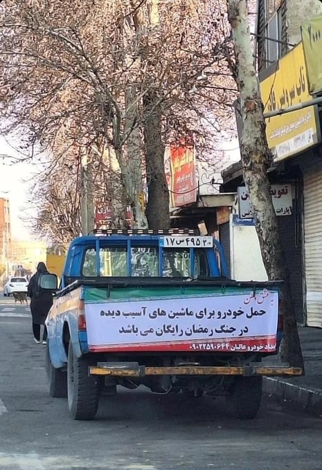 جنگ رمضان، خیلی از عواطفی را که تصور میکردیم در مرممان خشک شده، دوباره زنده کرد و به ما نشان داد که ایرانی، هر چه هم که باشد، پشت هم را خالی نمیکند. نمونهاش، کار سادهای است که یک نیسان آبی امدادخودرو انجام داده است. روی آن، بنری با طرح پرچم ایران نوشته: «حمل خودرو برای ماشینهای آسیبدیده در جنگ رمضان رایگان میباشد» و اینگونه تلاش کرده کاری برای هموطنان آسیبدیده از جنگ انجام دهد.