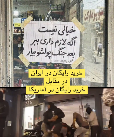 یک دختر چینی که در توییترش، خود را مترجم و علاقمند به ایران و زبان فارسی معرفی میکند و چند ماهی را هم در کشورمان زندگی کرده، عکسی را از شیشه یک مغاز در ایران منتشر کرده که کاغذی را با این مضمون رویش نوشته: «خیالی نیست، اگه لازم داری ببر، بعد جنگ پولشو بیار». در زیر آن هم «تعجیل فرج امام زمان صلوات» را نوشته است. او، در پایین همین عکس، ویدئویی از یکی از مغازههای آمریکایی را با کرکره بسته منتشر کرده که مردم به سمتش حملهور شده و در حال غارت کردن مغازه هستند و صدای ممتد آژیر هم به گوش میرسد. او عبارت «خرید رایگان در ایران در مقابل خرید رایگان در آمریکا» را در وسط این تصویر نوشته است که خود گویای فرهنگی غنی و والای ایران است.