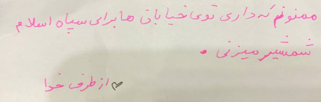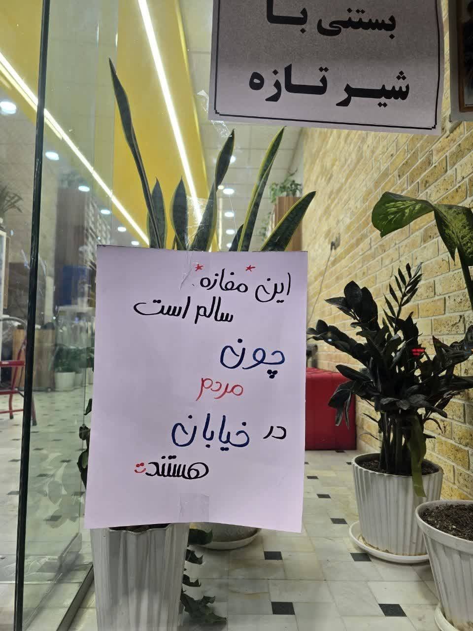 ایرانیها، مردم قدرشناسی هستند. پاسخ هر خوبی را هرطور که شده میدهند. نمونهاش را علیرضا دبیر در توییتر خود منتشر کرده و نوشته است: «سطح همدلی تو جامعه داره برمیگرده به حال و هوای دهه 60؛ این خیلی ارزشمنده». در این عکس، یک بستنیفروشی که از حملات دشمن جان سالم به دربرده، کاغذی روی شیشه مغازهاش چسبانده و رویش نوشته: «این مغازه سالم است چون مردم در خیابان هستند.» این شاید سادهترین و قشنگترین قدردانی از تلاشهای مردمی در دل خیابان باشد.