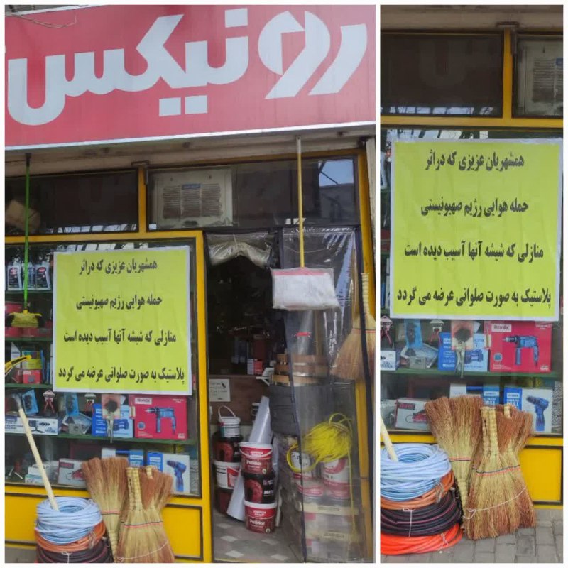 بر خلاف ادعای دشمن که میگوید مراکز نظامی در ایران را هدف می گیرند، بیشتر نقاط آسیب دیده منازل مسکونی بودند و با هر انفجار، شیشه بسیاری از خانه های مسکونی شکسته و خرد می شود. در این شرایط، یک مغازه ابزارفروشی در یکی از شهرهای ایران برای کمک به مردم آسیب دیده دست به کاری تحسین برانگیز زد. او در توان خود قدمی برای هموطنانش برداشته و بنری را به شیشه مغازه آویزان کرده و روی آن نوشته است: «همشهریان عزیزی که در اثر حمله هوایی رژیمصهیونیستی، منازلی که شیشه آنها آسیب دیده است، پلاستیک به صورت صلواتی عرضه میگردد.»