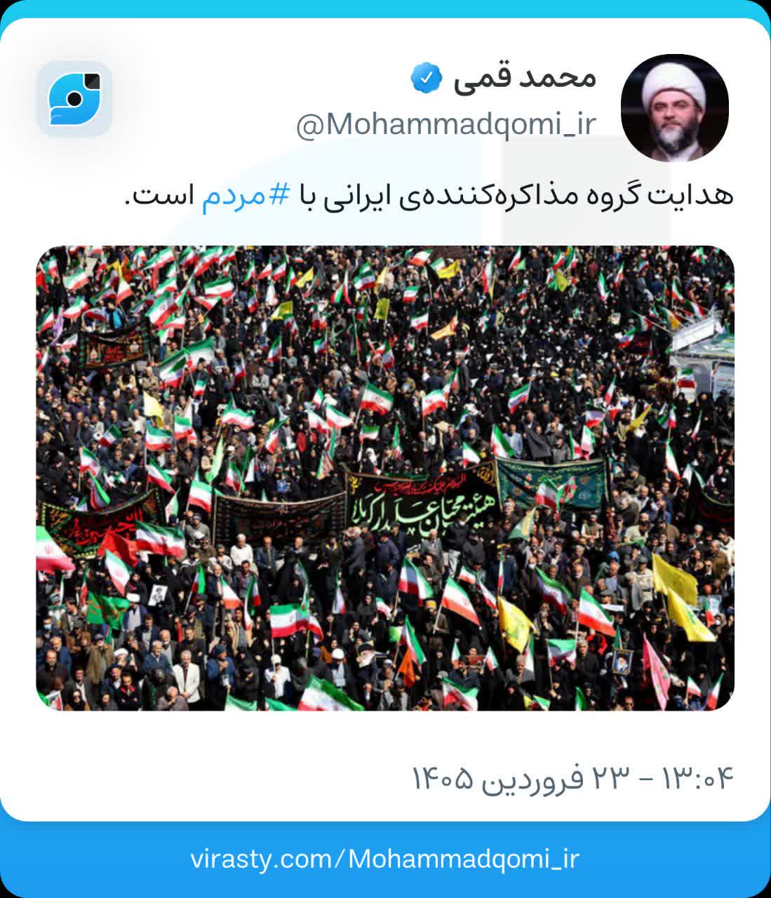 به گزارش روابط عمومی سازمان تبلیغات اسلامی، حجتالاسلام محمد قمی، رئیس سازمان تبلیغات اسلامی همزمان مذاکرات ایران و آمریکا در پاکستان در صفحه شخصی خود در شبکه اجتماعی ویراستی نوشت؛
