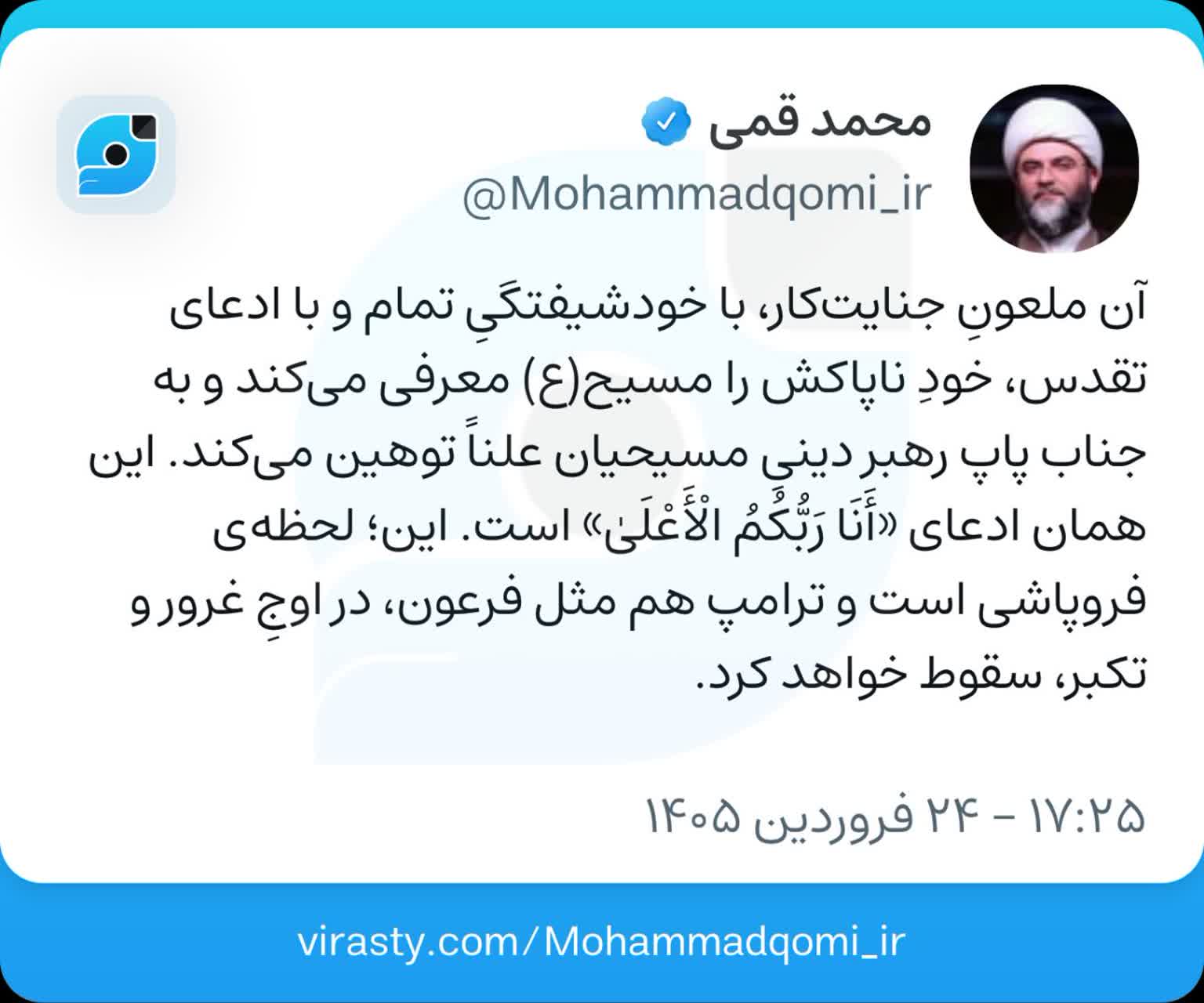 آن ملعونِ جنایتکار، با خودشیفتگیِ تمام و با ادعای تقدس، خودِ ناپاکش را مسیح (ع) معرفی میکند و به جناب پاپ رهبر دینیِ مسیحیان علناً توهین میکند. این همان ادعای «أَنَا رَبُّكُمُ الْأَعْلَیٰ» است. این؛ لحظهی فروپاشی است و ترامپ هم مثل فرعون، در اوجِ غرور و تکبر، سقوط خواهد کرد.