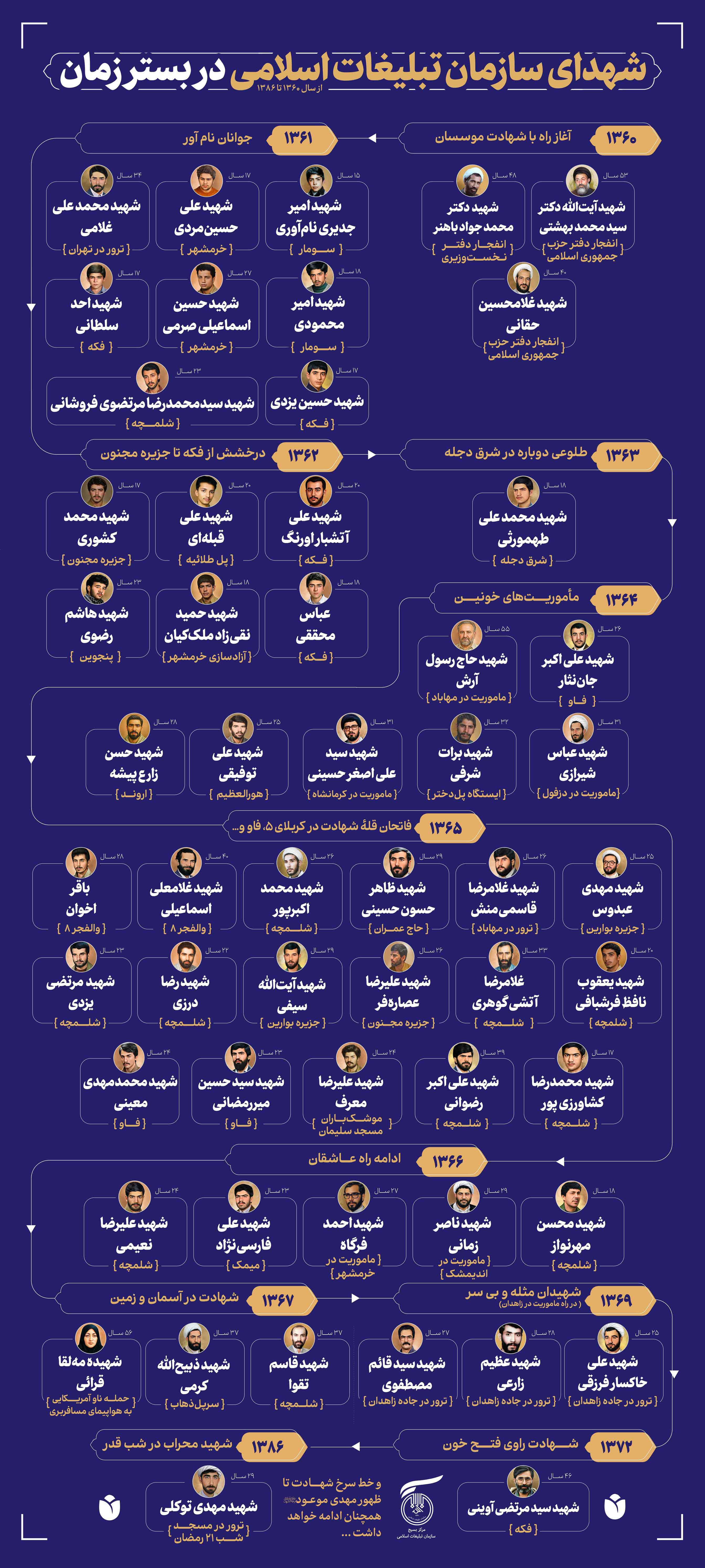 مجموعه‌ اینفوگرافیک‌های تحلیلی شهدای سازمان تبلیغات اسلامی به تفکیک استان و سال شهادت به تصویر کشیده شده‌اند. این گزارش تصویری، نگاهی آماری و بصری به گستره ایثار در جغرافیای وطن و گذر زمان دارد.