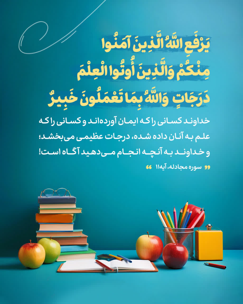 🌿 يَرْفَعِ اللَّهُ الَّذِينَ آمَنُوا مِنْكُمْ وَالَّذِينَ أُوتُوا الْعِلْمَ دَرَجَاتٍ وَاللَّهُ بِمَا تَعْمَلُونَ خَبِيرٌ . 🍀 خداوند کسانی را که ایمان آورده‌اند و کسانی را که علم به آنان داده شده، درجات عظیمی می‌بخشد؛ و خداوند به آنچه انجام می‌دهید آگاه است! 📖 سوره مجادله، آیه۱۱.