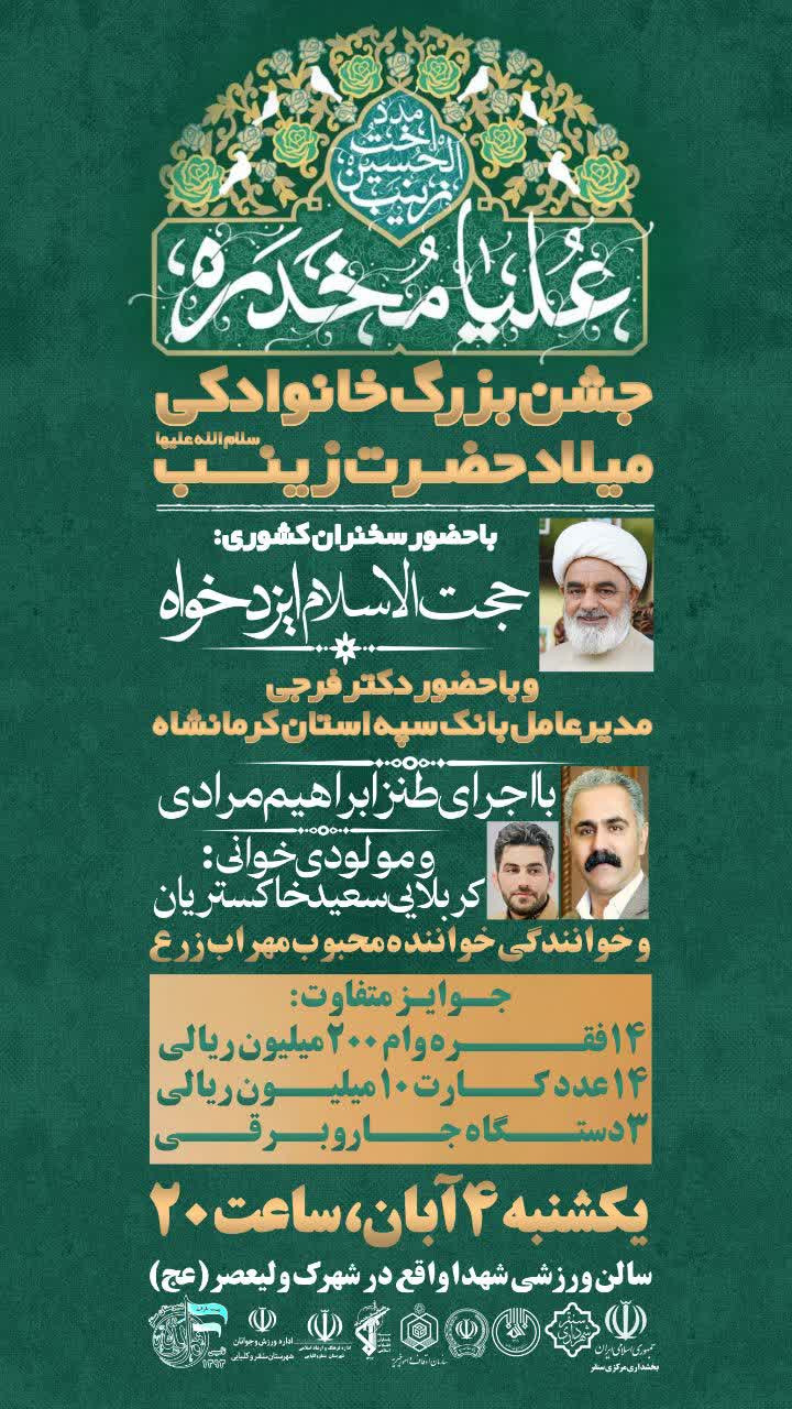 جشن بزرگ خانوادگی میلاد حضرت زینب سلام الله علیها یکشنبه شب راس ساعت ۲۰ سالن ورزشی شهدای شهرک ولیعصر(عج) منتظرحضور پرشور شما همشهریان عزیز هستیم .